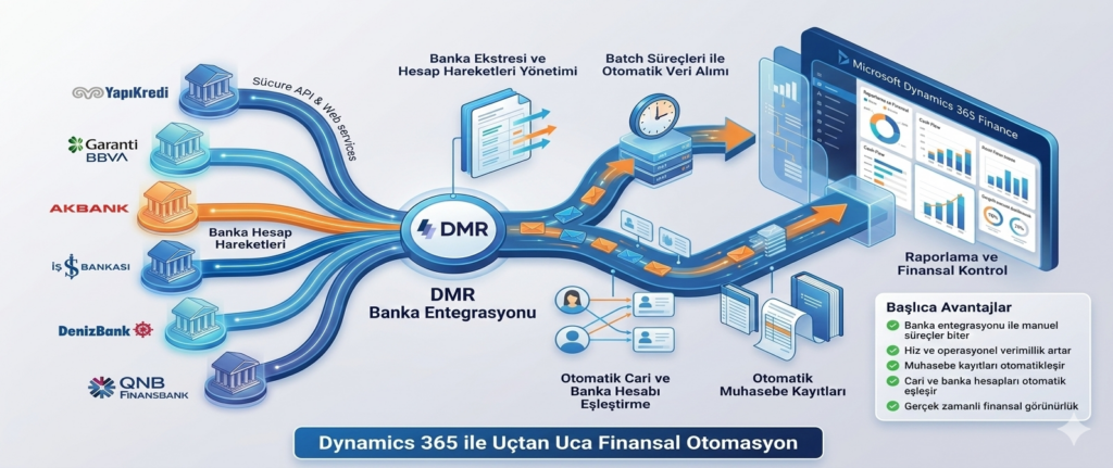 DMR tarafından Microsoft Dynamics 365 Finance üzerinde geliştirilen Banka Entegrasyonu çözümü, şirketlerin banka hesap hareketlerini manuel dosya indirme ve yükleme süreçlerine ihtiyaç duymadan doğrudan ERP sistemine aktarabilmesini sağlar.